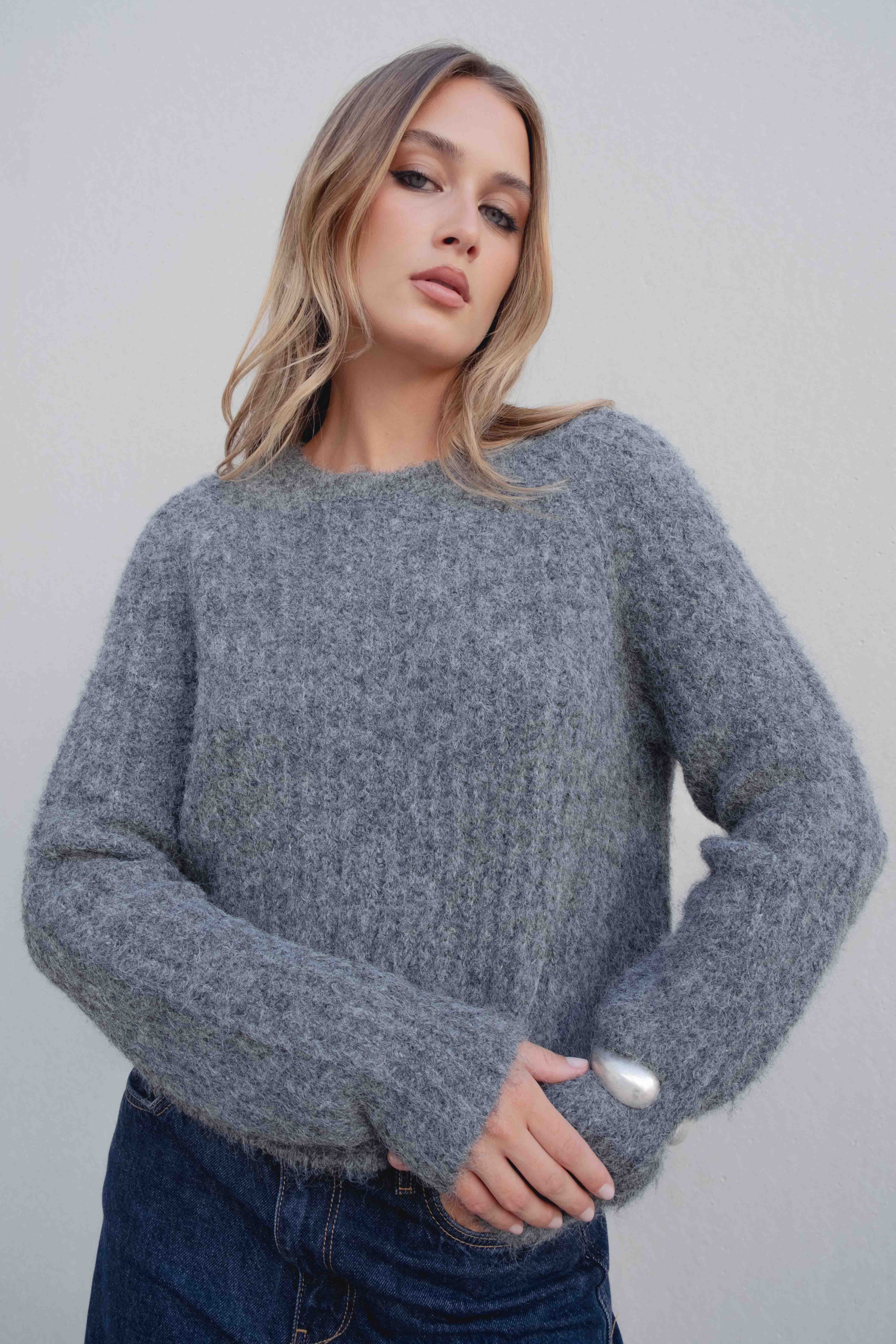 Jersey amplio de punto con cuello redondo y manga larga. Acabados en rib.