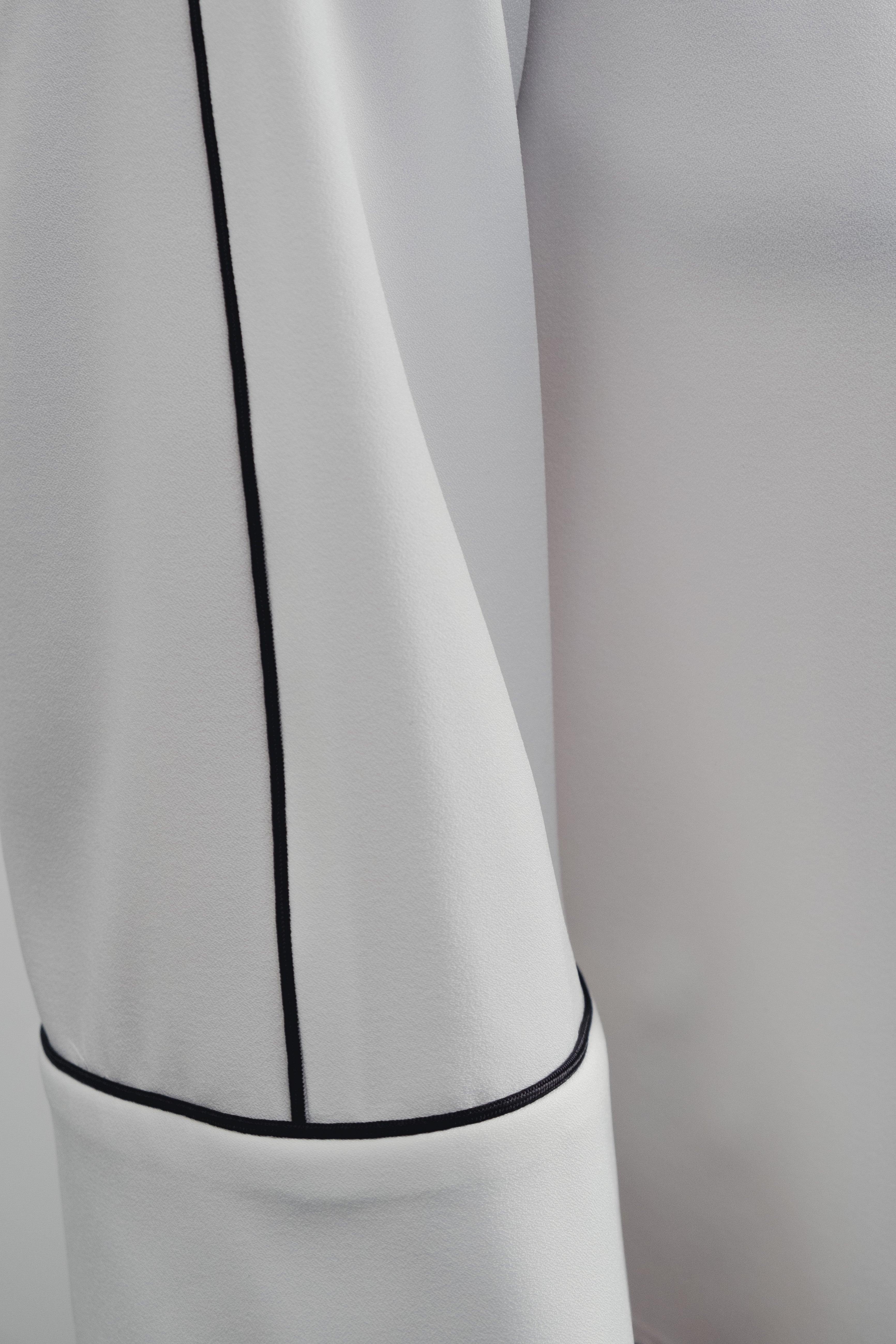 Blusa de cuello barco y manga larga. Detalle de acabados con vivos combinados a contraste.