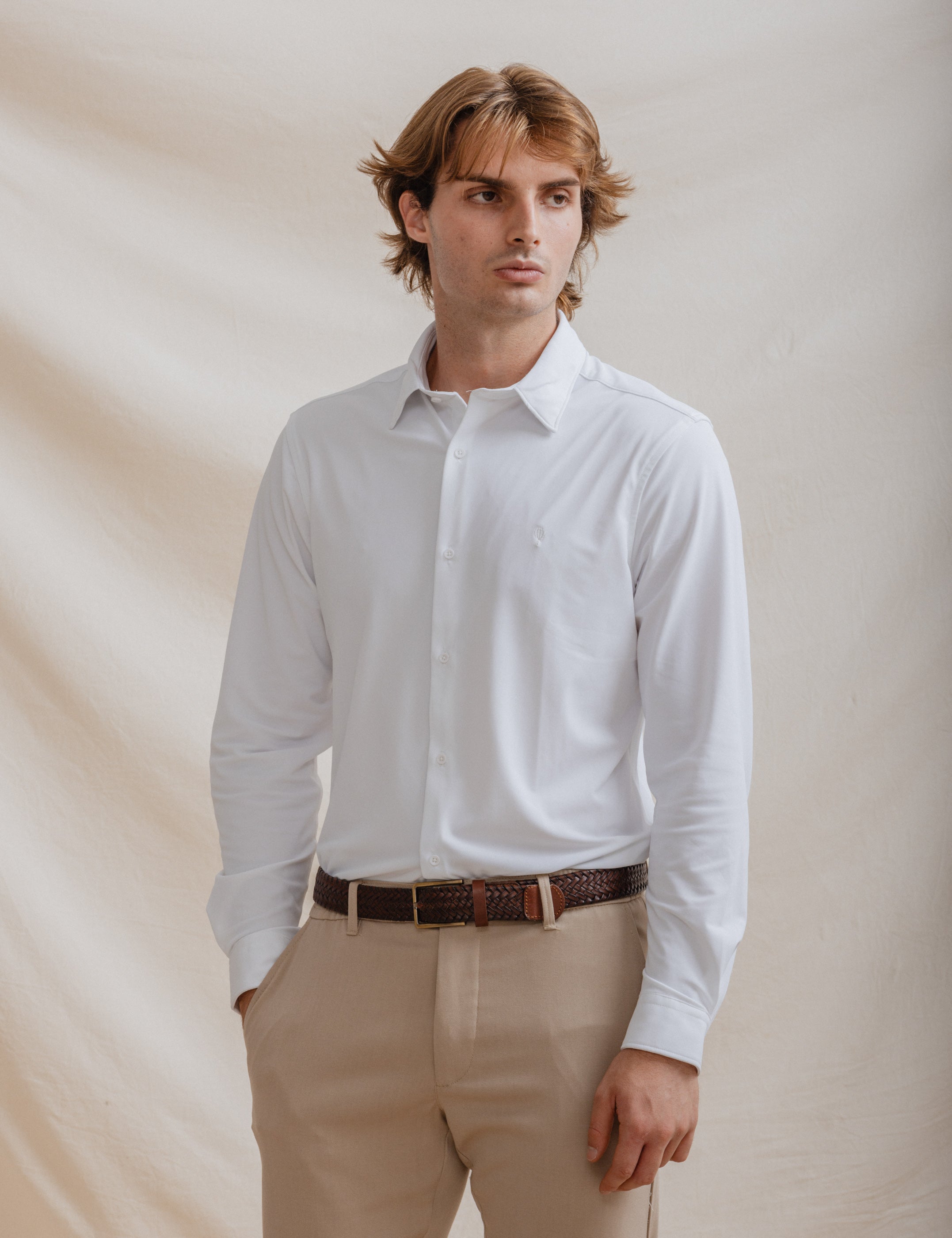 Camisa elástica para hombre en color blanco confeccionada en 88% poliamida y 12% elastano . Camisa de mangas largas y puños simples y cuello sin botón. Corte regular fit. Logo al tono a la altura del pecho.