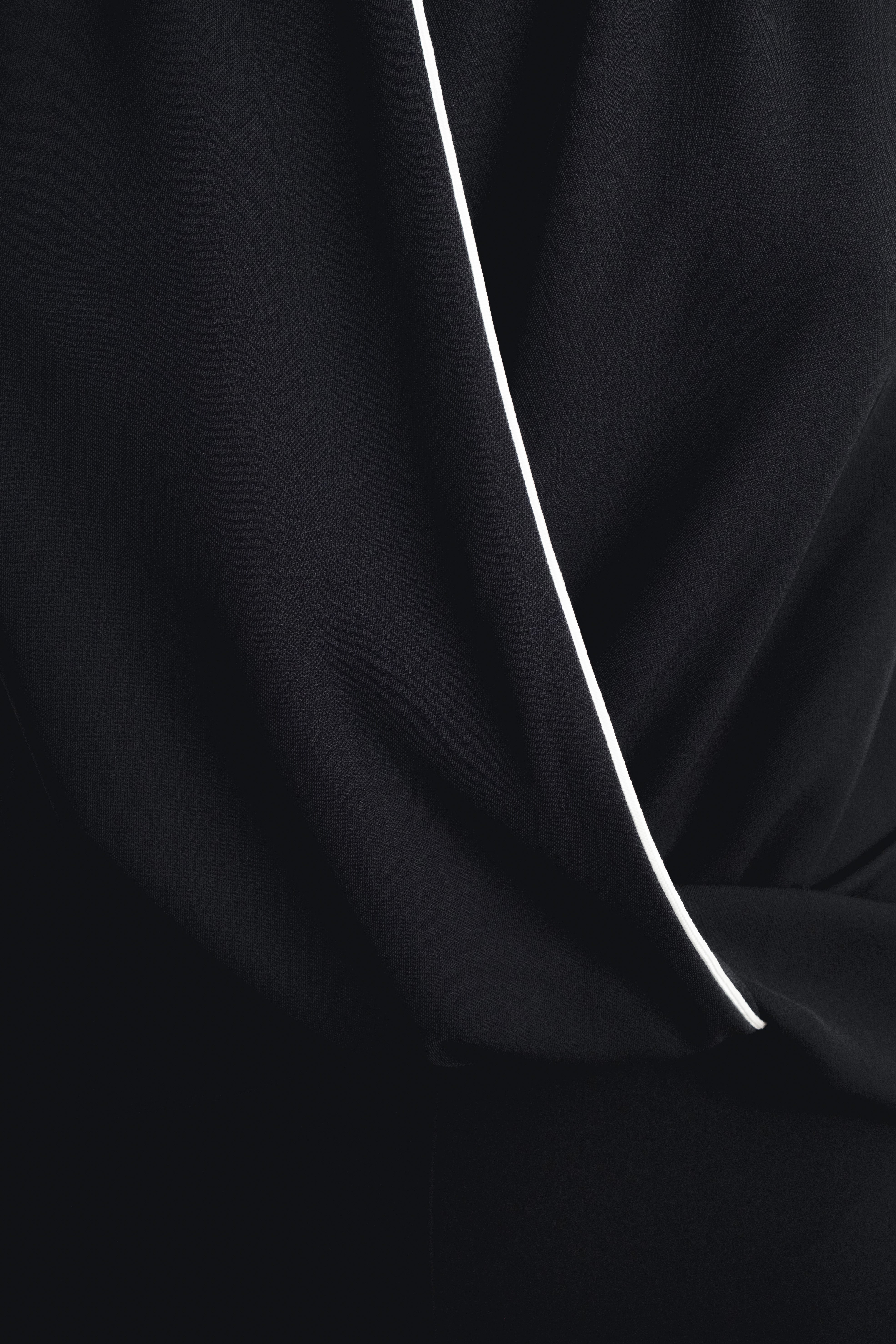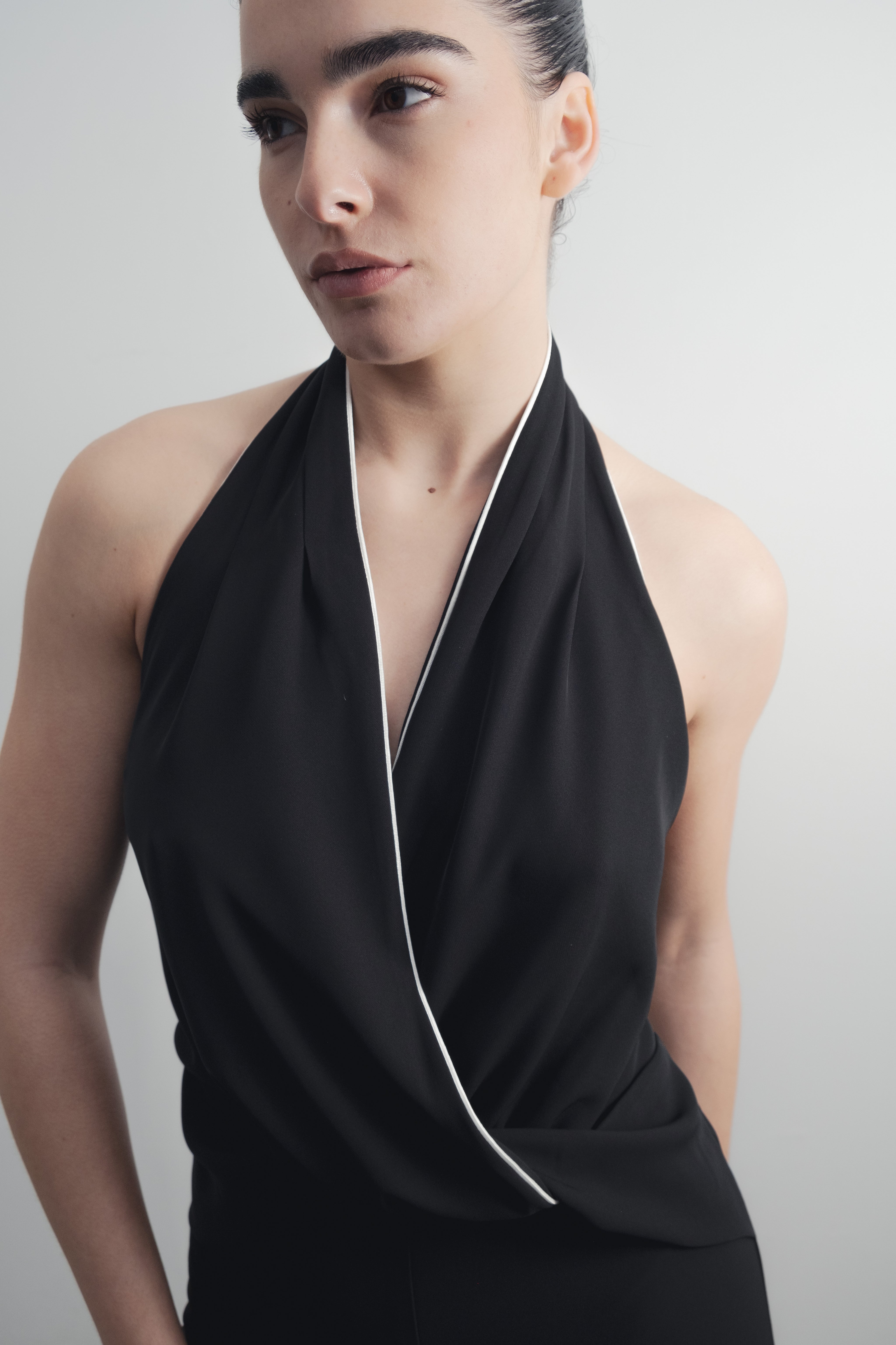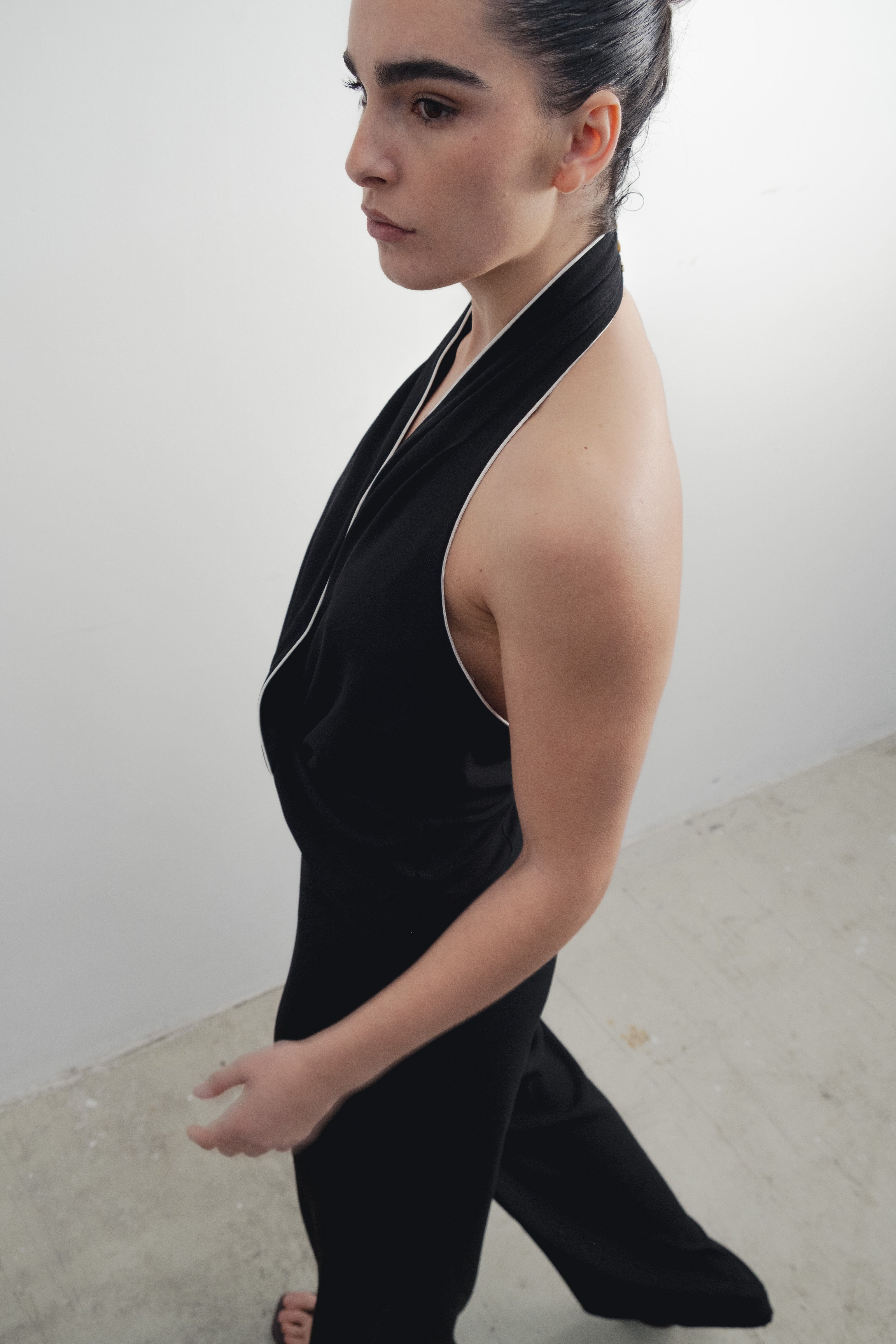 Mono de cuello halter con escote pico pronunciado y espalda descubierta. Detalle de nudo delantero. Pernera ancha. Cierre en espalda con cremallera oculta en costura y botones ocultos en cuello. Detalle de vivos combinados a contraste.