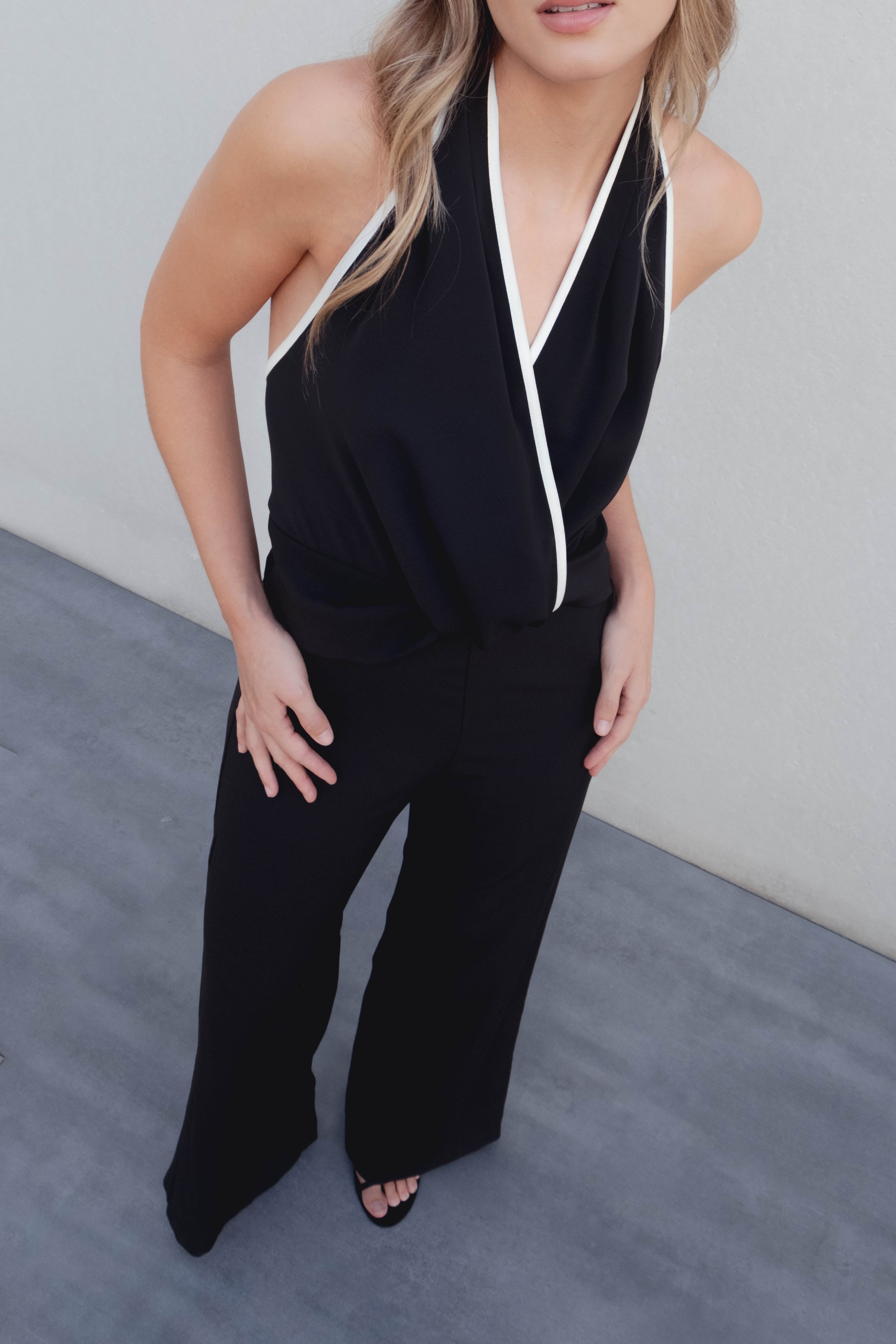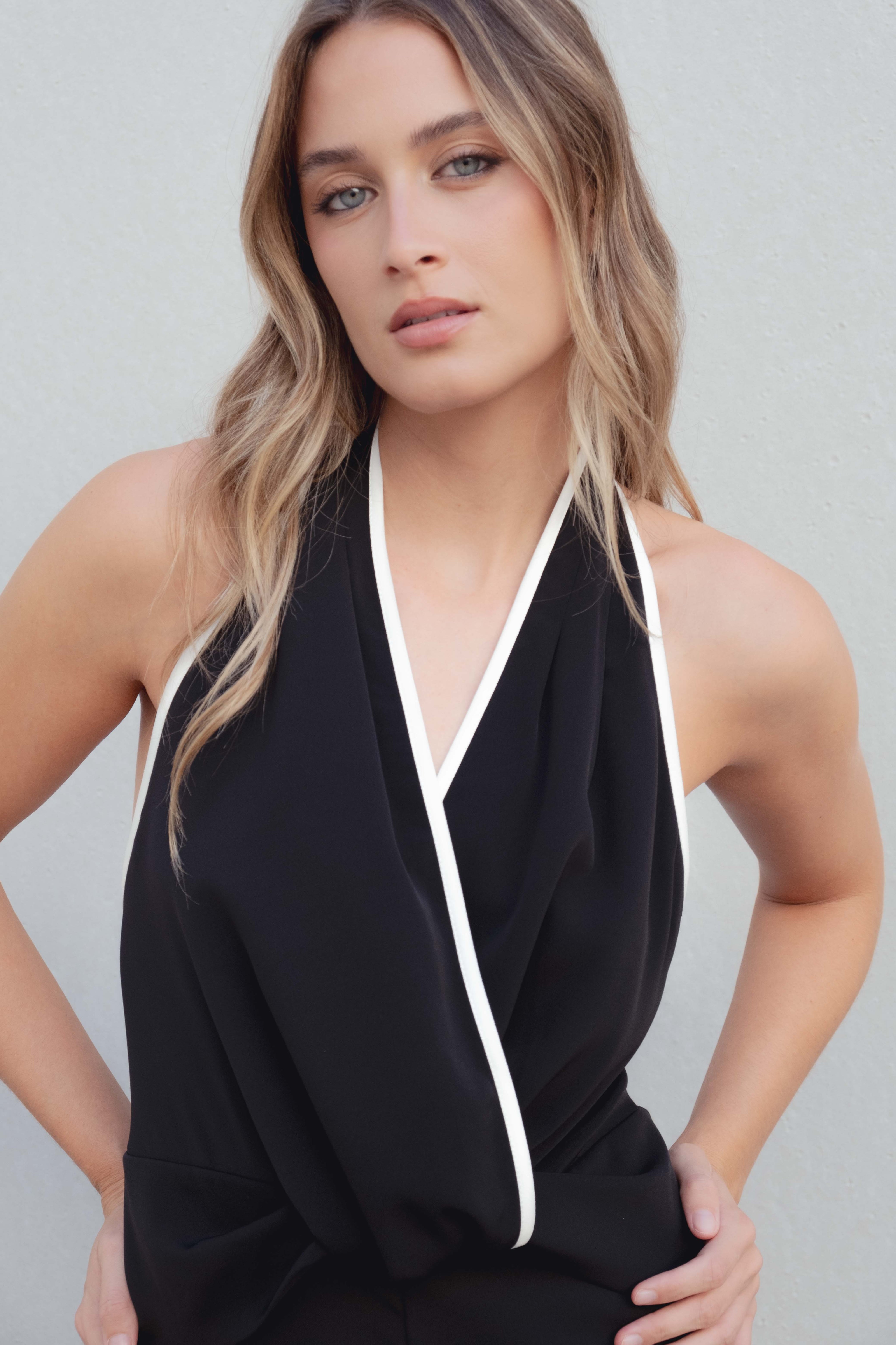 Mono de cuello halter con escote pico pronunciado y espalda descubierta. Detalle de nudo delantero. Pernera ancha. Cierre en espalda con cremallera oculta en costura y botones ocultos en cuello. Detalle de vivos combinados a contraste.