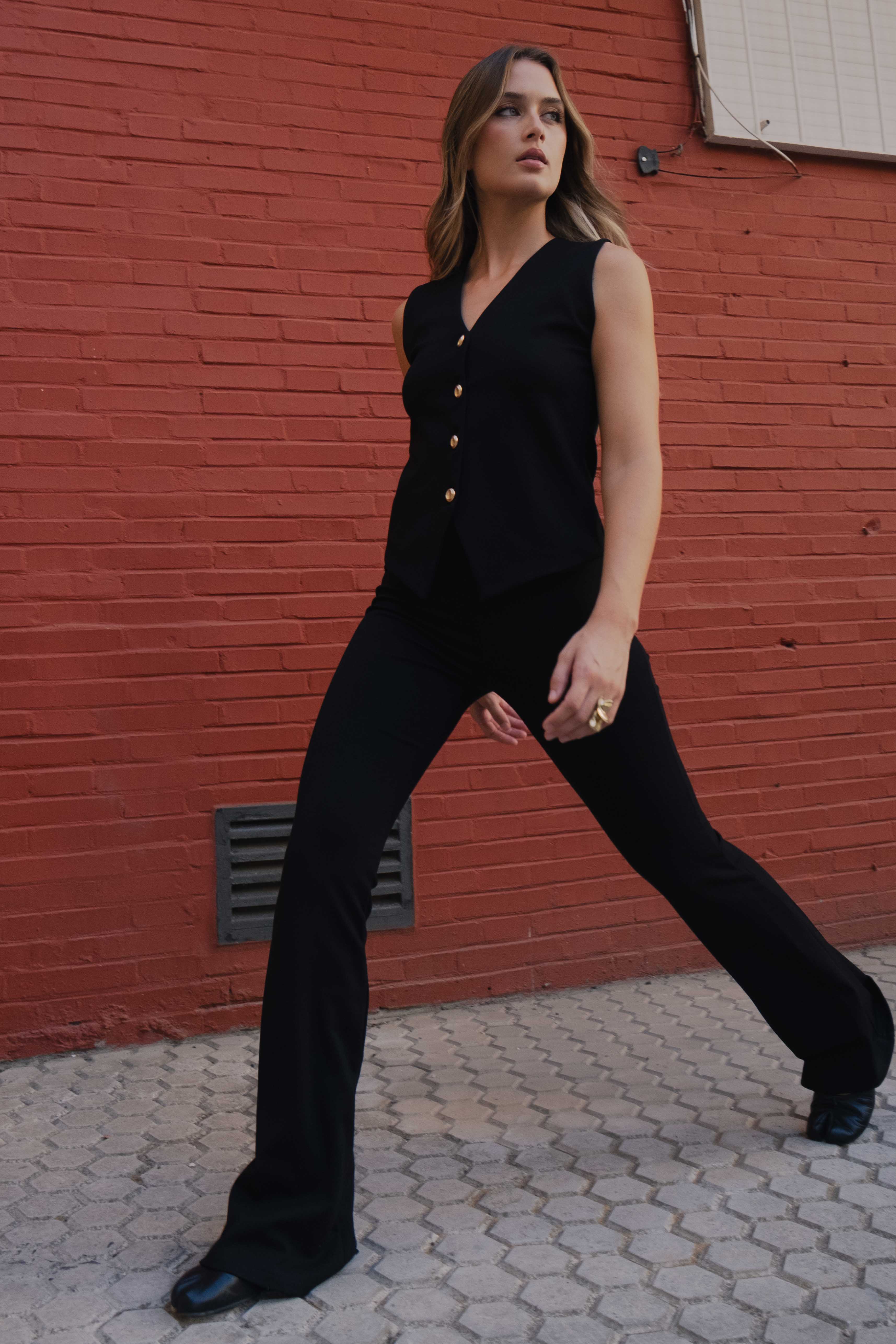 Top chaleco de escote pico y manga sisa. Cierre frontal con botones.