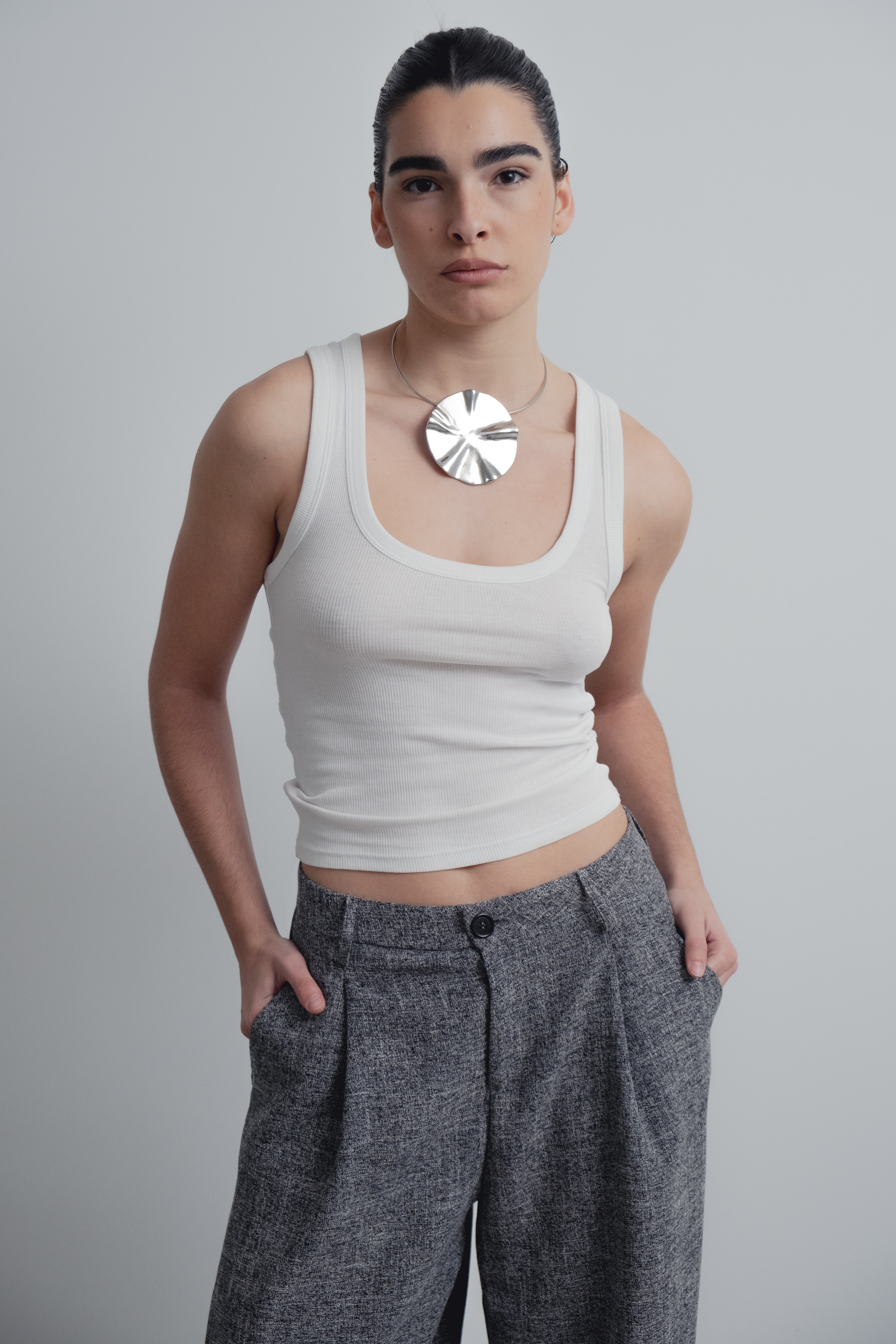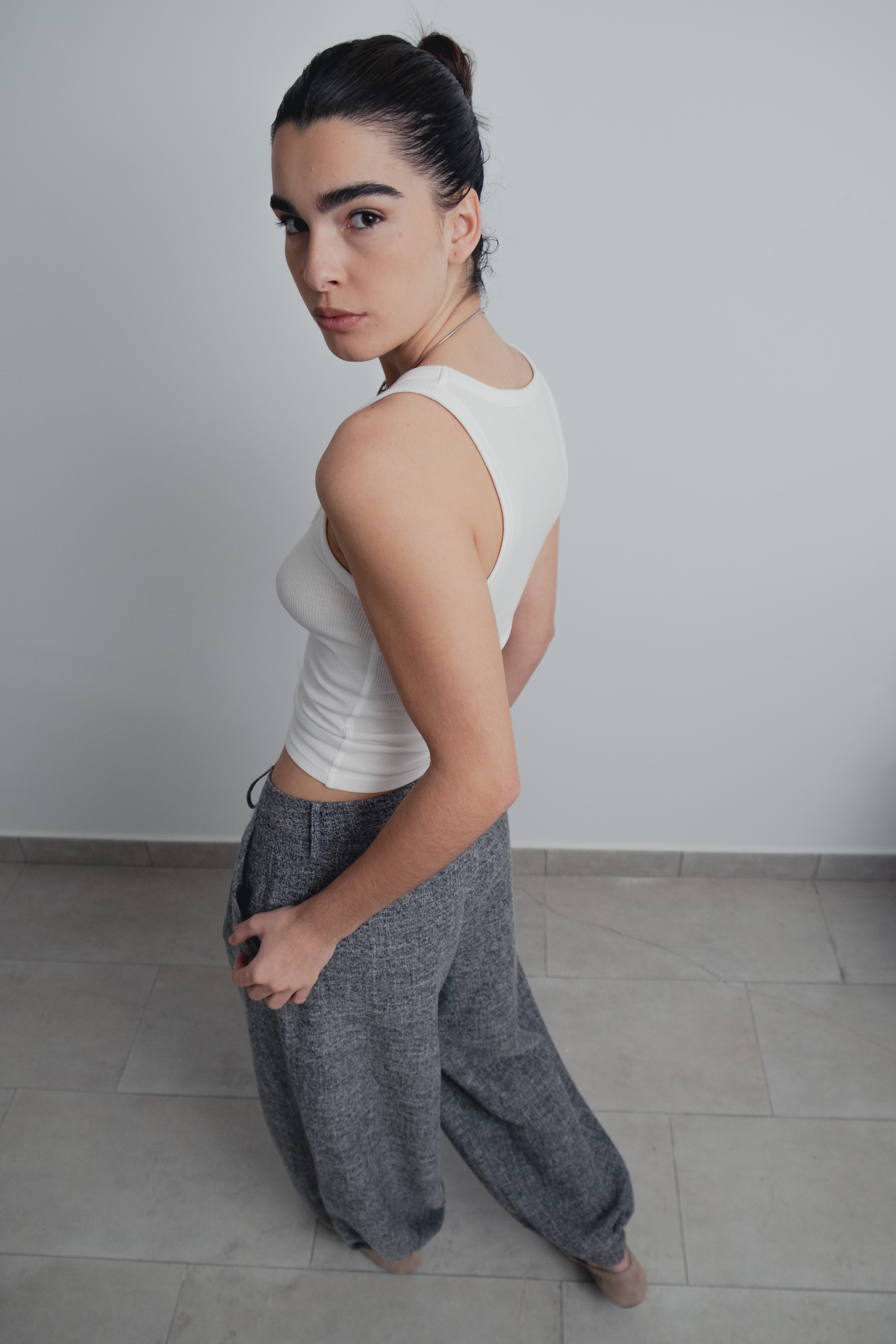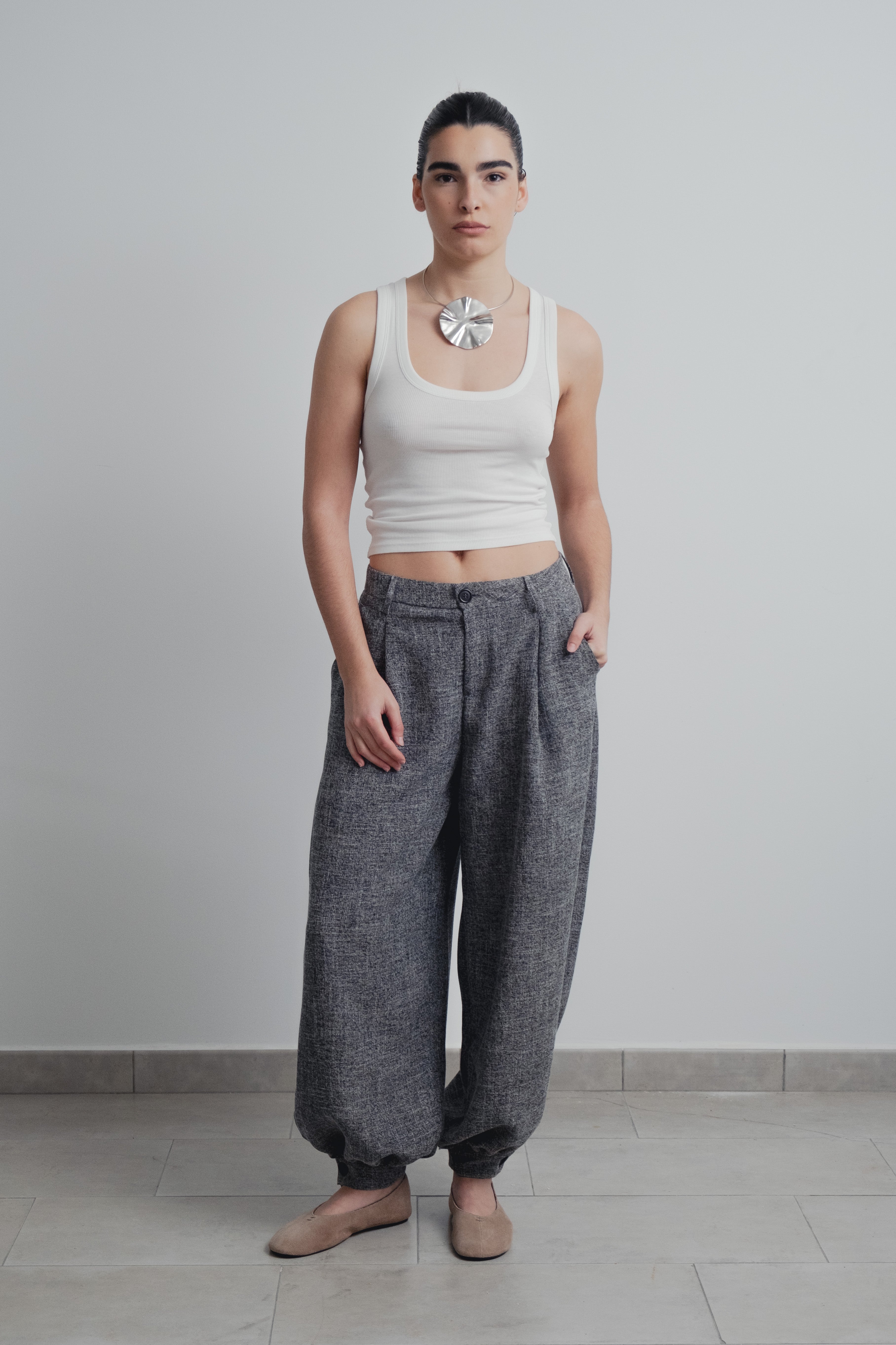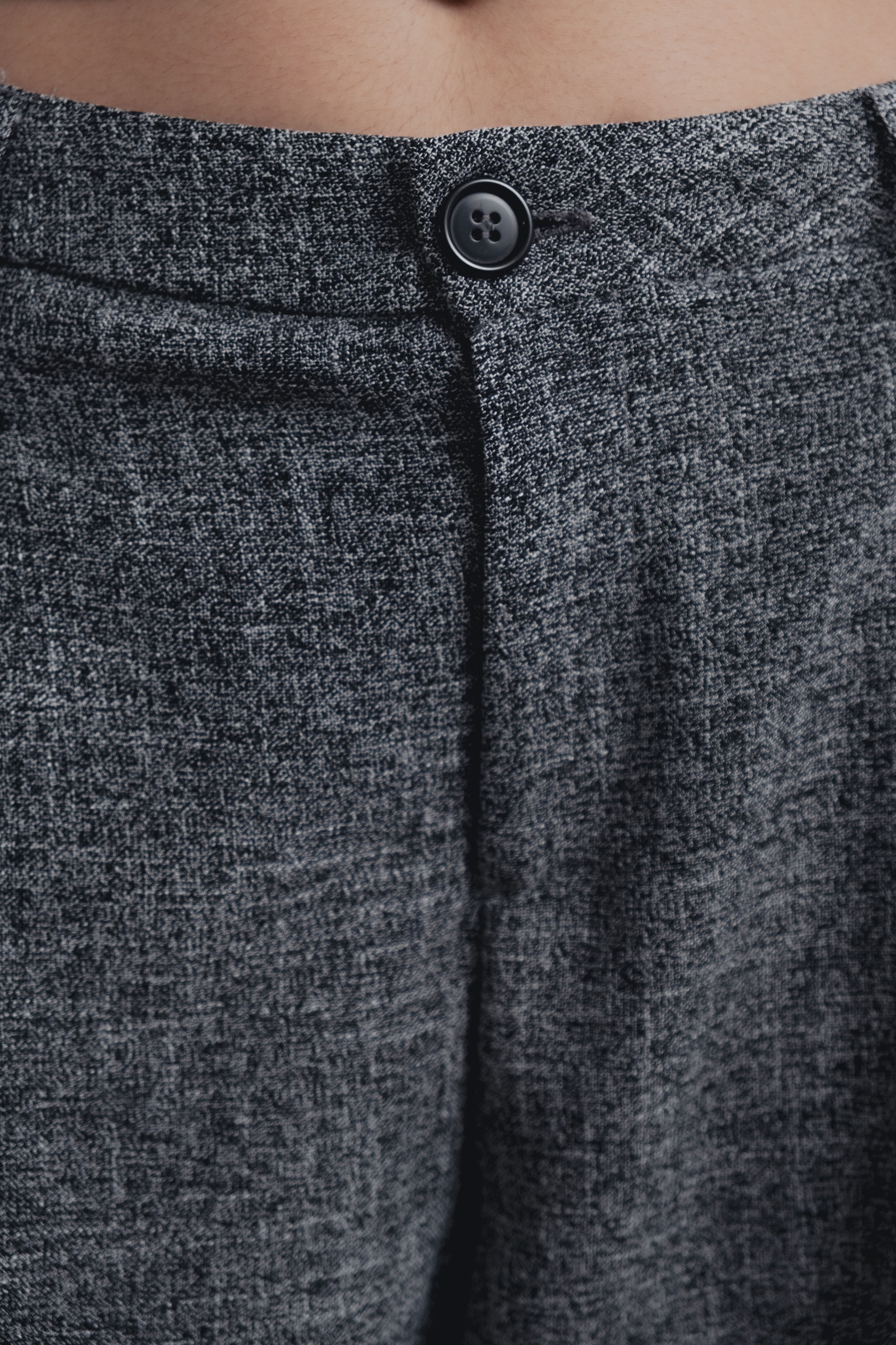 Pantalón de tiro medio y cintura con trabillas. Bolsillos laterales. Detalle de pinzas en delantero. Bajo acabado en puño con botón. Cierre frontal con cremallera y botón.