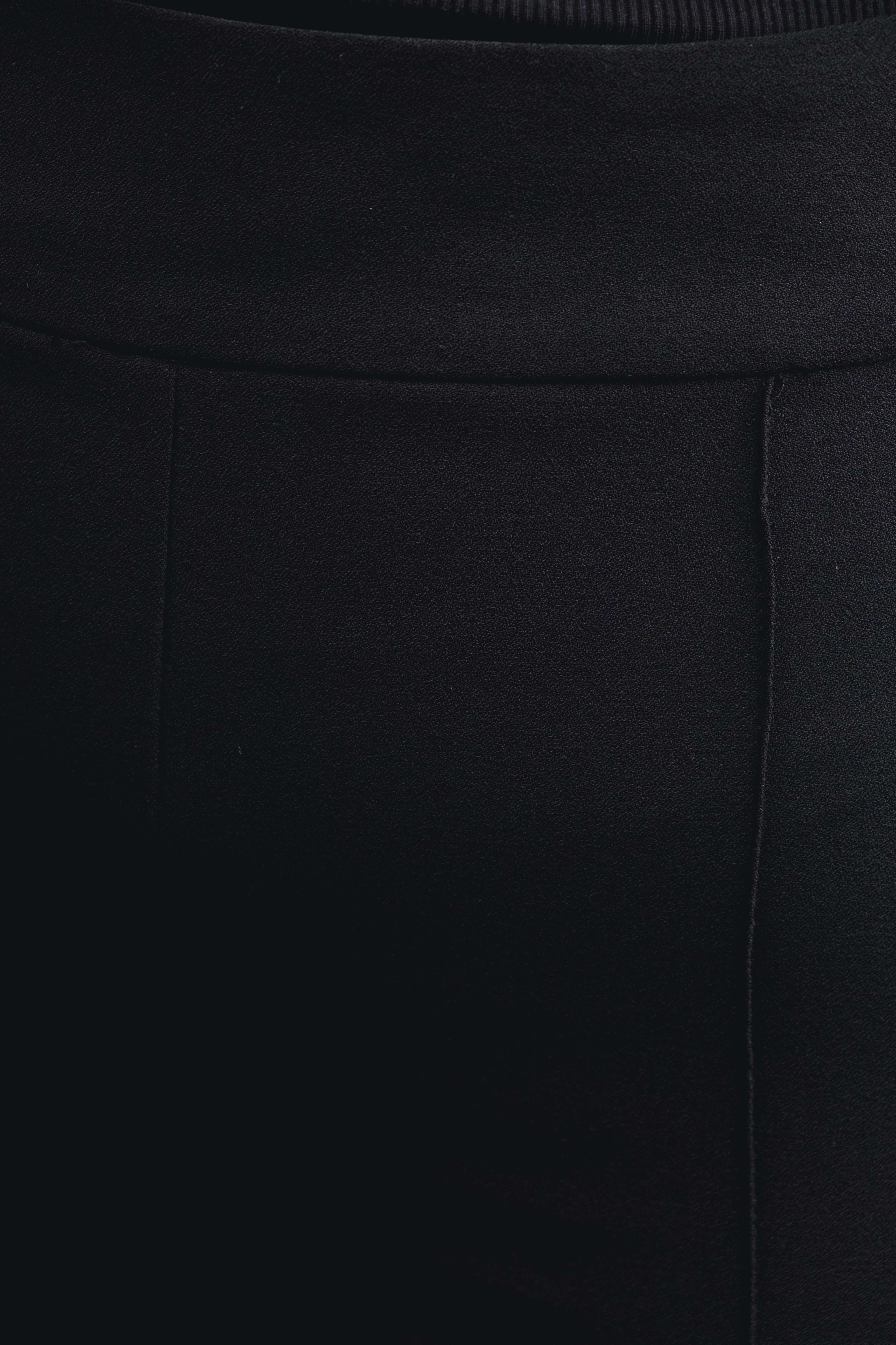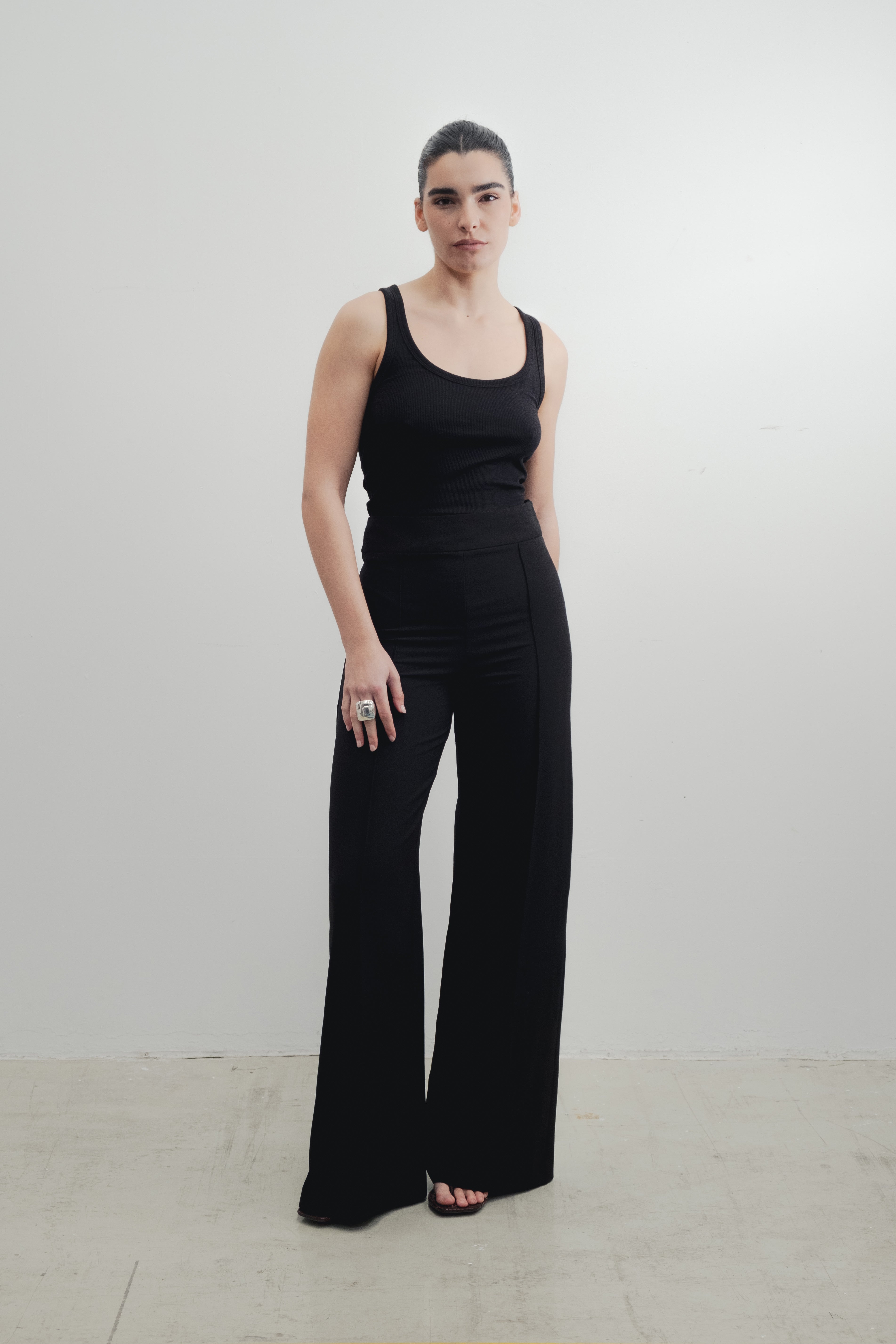 Pantalón de tiro alto y pernera ancha. Cierre lateral con cremallera oculta en costura.