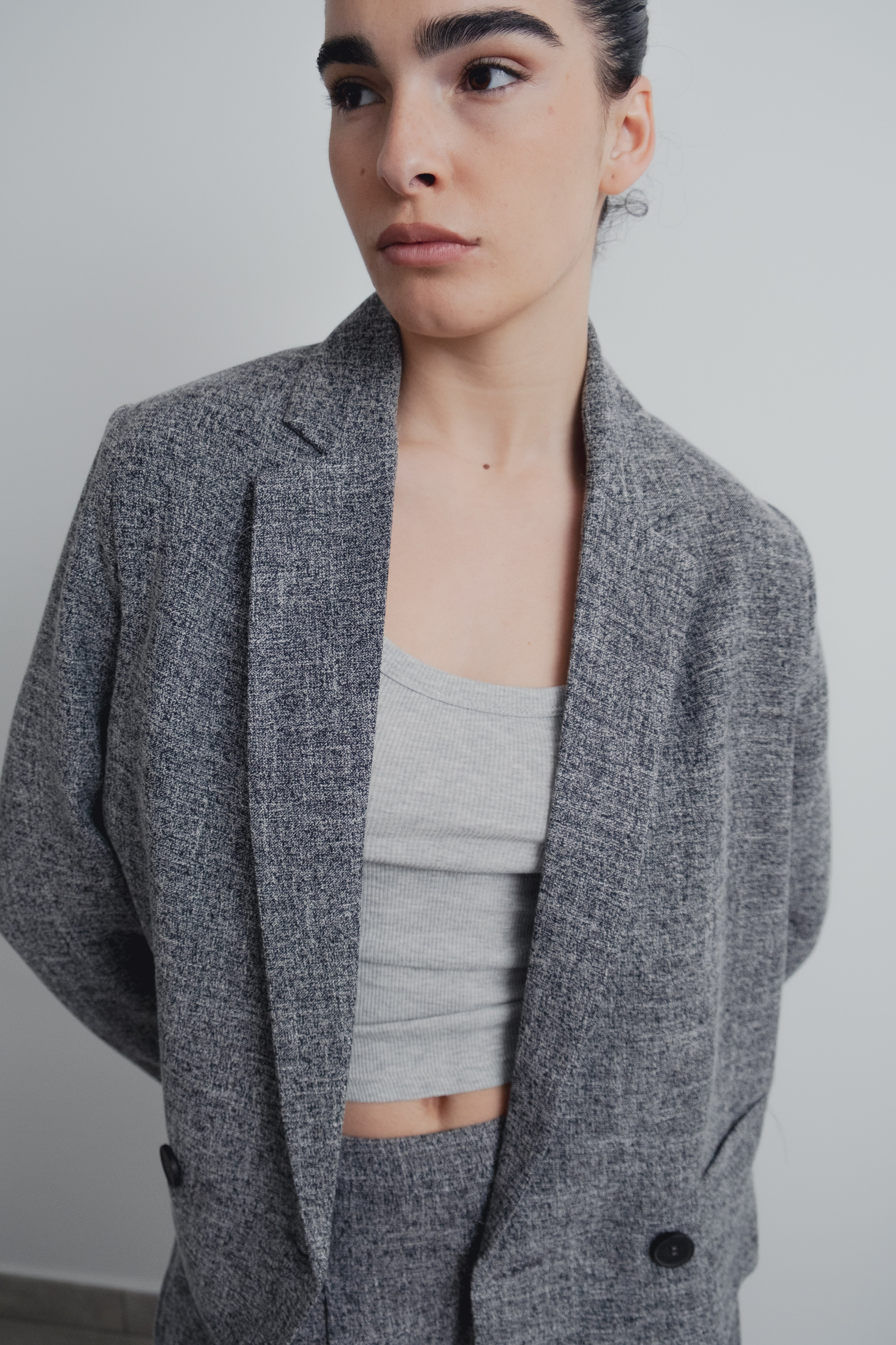 Blazer corta de cuello solapa y manga larga con hombreras. Detalle bolsillos en delantero. Cierre frontal cruzado con botones.
